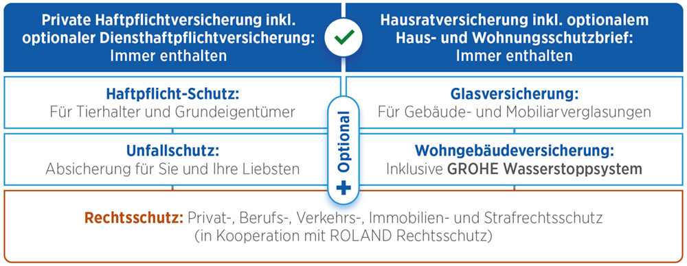 Zu den Basis-Versicherungsbausteinen Haftpflicht und Hausrat können so nach Bedarf weitere Verischerungsbausteine hinzugefügt werden: